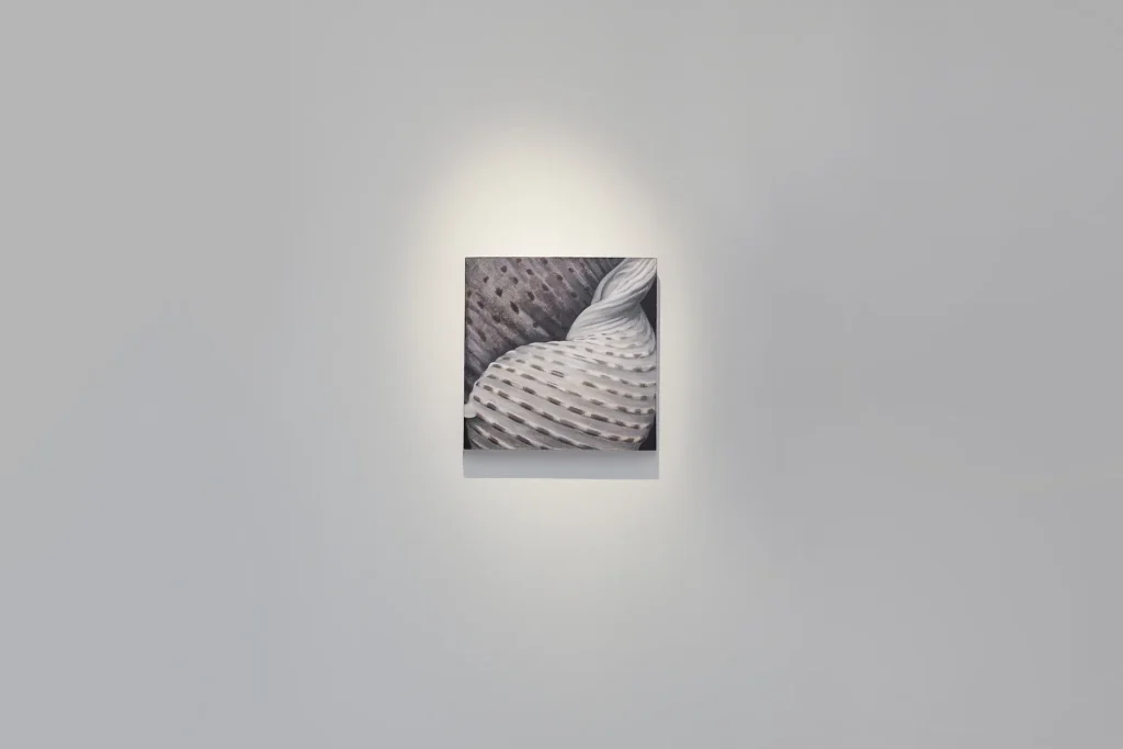 在近作中,歆迪的创作呈现出一条由物质形态探索逐渐深入至绘画本体论的思考路径:她对自然物的描绘逐渐抽离了具体的空间与形貌,通过其既有的、近乎抽象的自然几何属性构筑起画面空间的延展性,与此同时,又以致微的观察与细腻的纹理刻画保留具象的暗示,进而赋予形式以既具材质感又富有机性的律动。